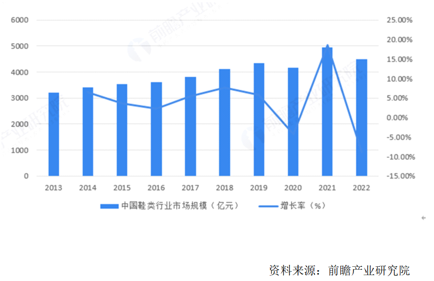 圖 2 2013-2022年中國鞋類行業(yè)市場規(guī)模及增長率(單位:億元,%)